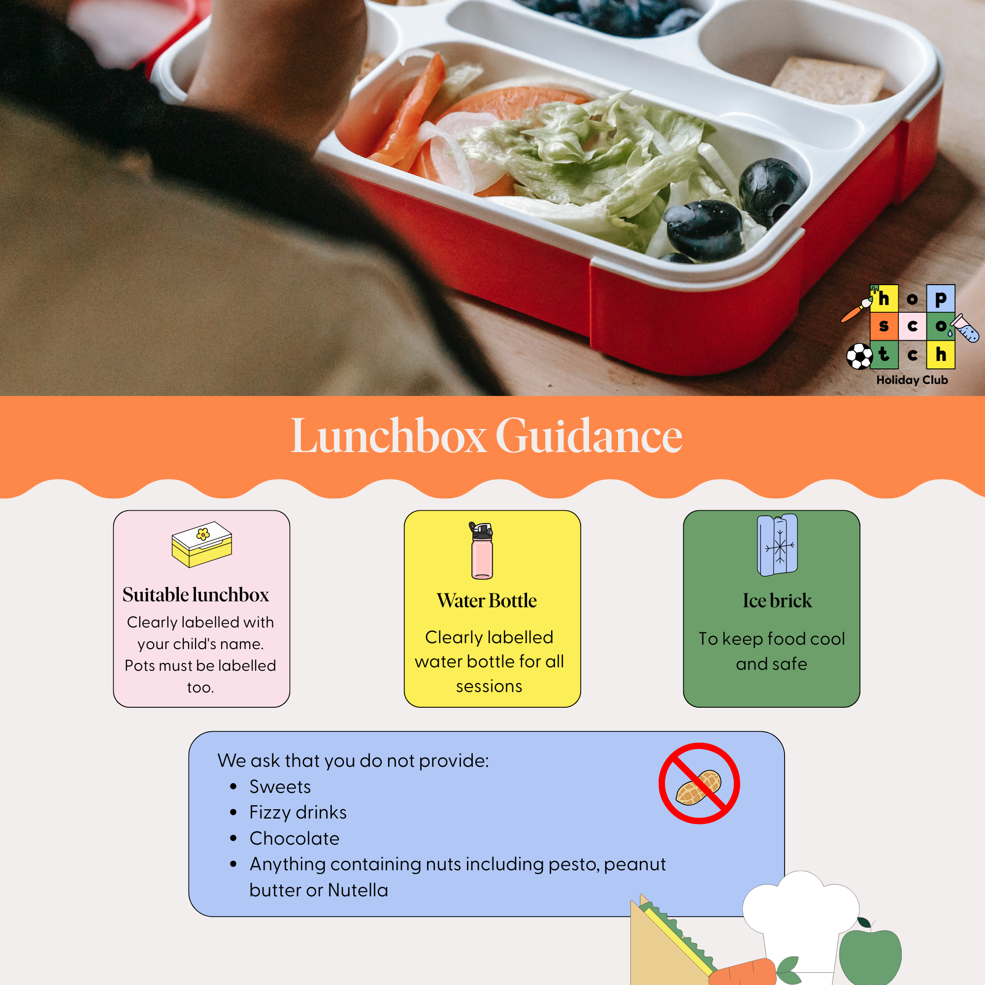 Please take a moment to read our lunchbox guidance below, which helps us keep all children safe, comfortable and ready for a fun-filled day at Holiday Club.