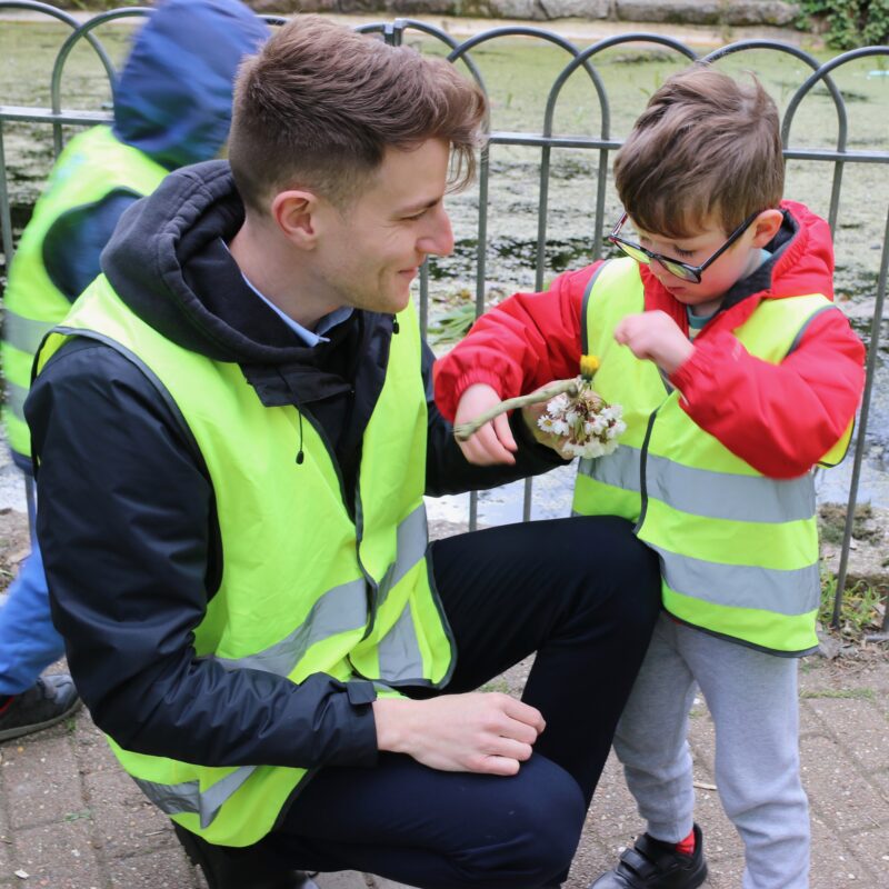 Hopscotch Explorers headed to St. Ann’s Well Gardens for an outdoor adventure. The focus of the session was to create a journey stick. After a fun walk to the park the children listened to a story before beginning their activity. In pairs they held a stick with a long piece of string tied to the top. The children then hunted around areas of the park together in search of natural finds. If they found something they wanted to keep they used the string on the sticks to secure the item onto their stick. By the end of the session the children had sticks filled with leaves, petals and feathers which they took back to nursery. They then talked their friends through their nature journey using the sticks to remind them where they picked bits up from.